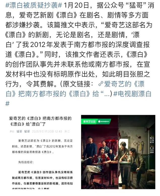 然而,树大招风,《漂白》突然被指抄袭,这是在20日的时候某位作者发出的信息,他表示这部剧抄袭了自己在2012年的时候在南方都市报上发表的一篇文章,也叫《漂白》,并称无论是剧情还是里面的情节包括这部剧的题目都是抄袭了自己的那篇报道的文章。
