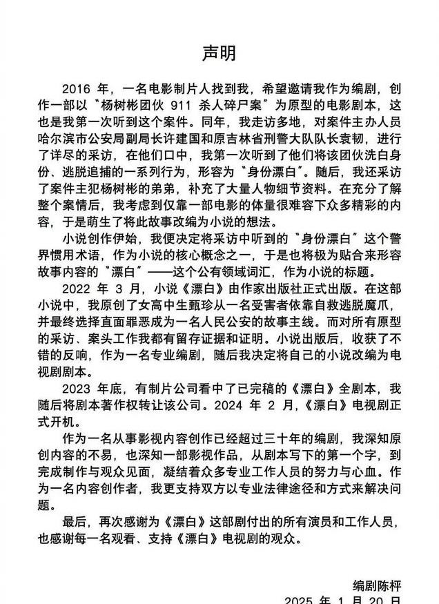 电视剧《漂白》被指抄袭, 编剧发文回应, 希望通过法律方式解决!